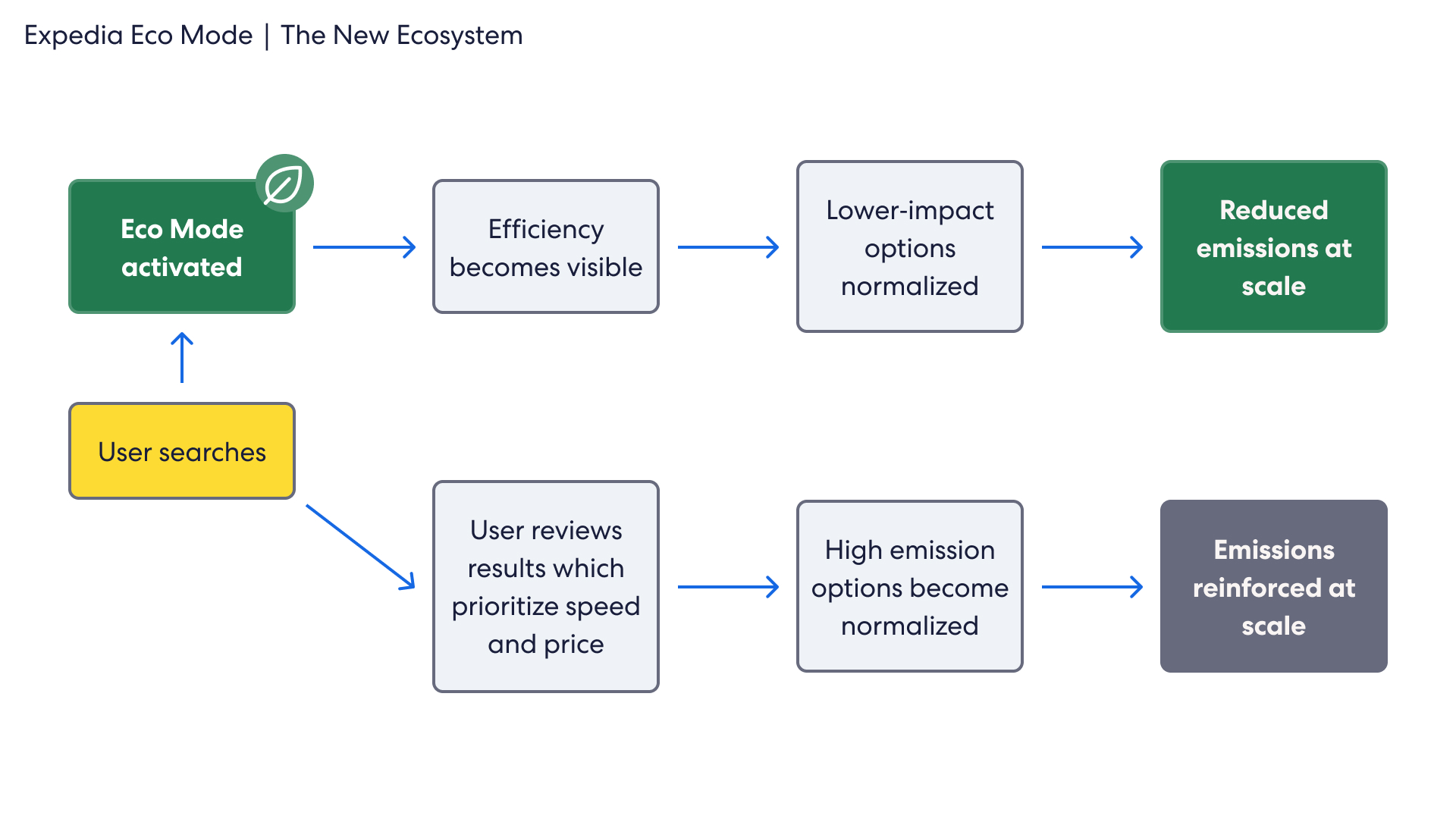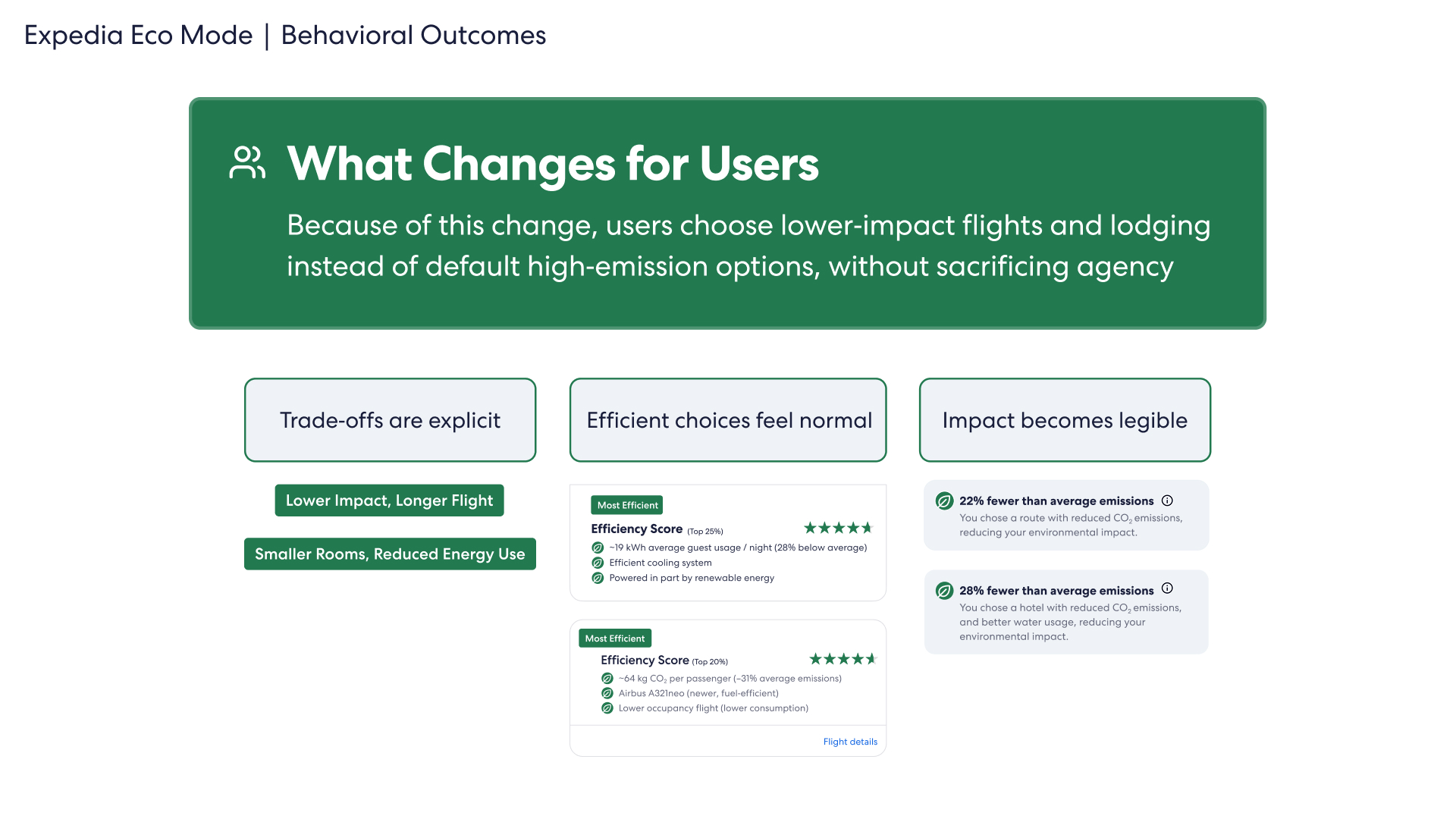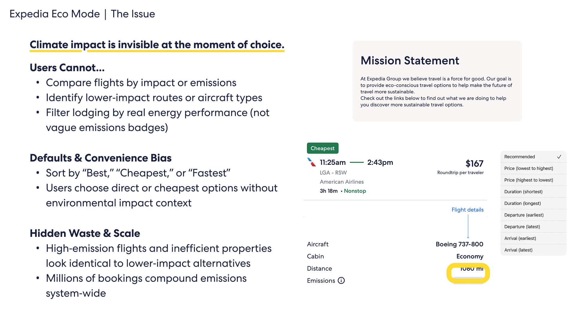 speculative feature design for expedia, focused on creating a climate-positive improvement to the service. eco mode makes climate impact visible to users when making important travel decisions.